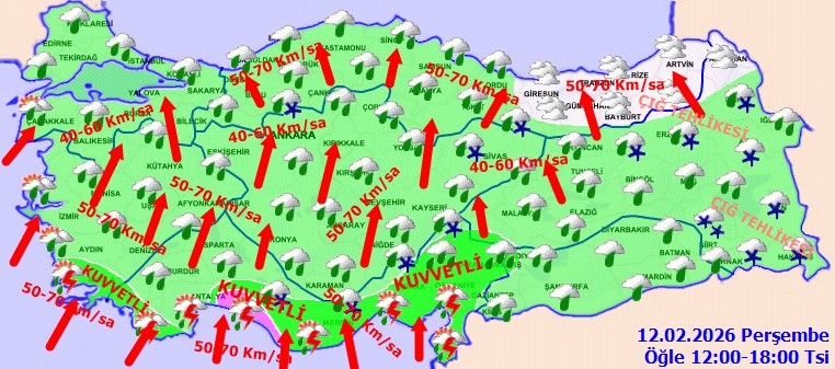Rüzgârın; Marmara, Ege, Akdeniz, İç Anadolu ve Karadeniz’de güneyli yönlerden kuvvetli ve zaman zaman fırtına şeklinde (40-80 km/saat) esmesi beklendiğinden yaşanabilecek olumsuzluklara karşı dikkatli ve tedbirli olunması gerekmektedir.