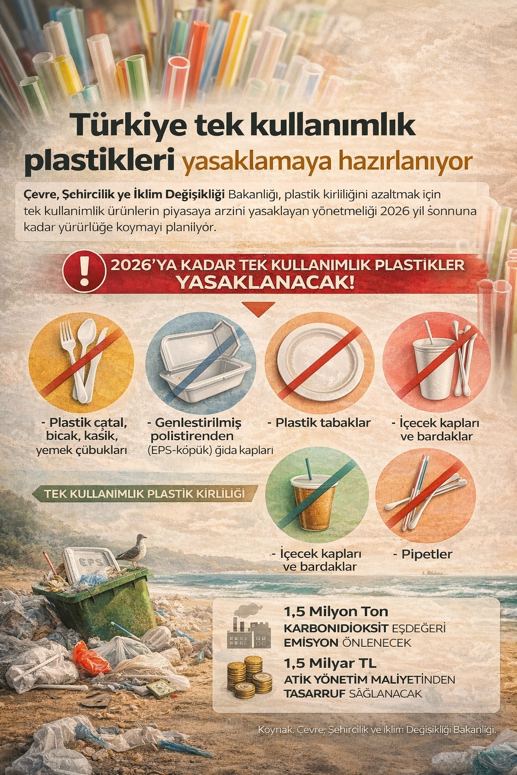 Çevre, Şehircilik ve İklim Değişikliği Bakanlığı, plastik kirliliğini azaltmak için tek kullanımlık plastik ürünlerin piyasaya arzını yasaklayan yönetmeliği 2026 yıl sonuna kadar yürürlüğe koymayı planlıyor. Çevre Bülteni Doğanın Hikâyesine Ortak Ol Her hafta iklim krizi, çevre kirliliği ve sürdürülebilirlikle ilgili en önemli haberleri al. Bültene Kaydol → × İlk İsim Email I accept the privacy … Türkiye tek kullanımlık plastikleri yasaklamaya hazırlanıyor okumayı sürdür