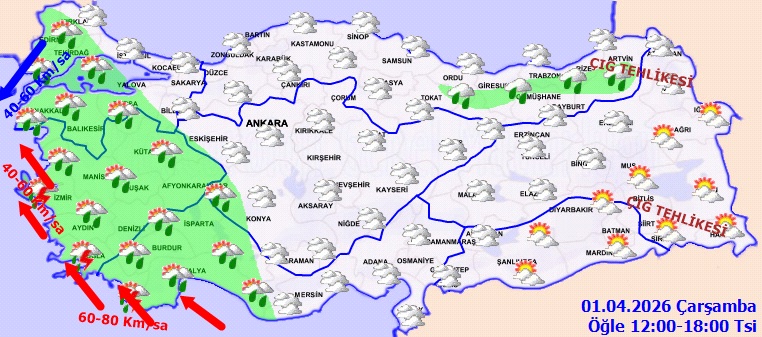 Meteoroloji Genel Müdürlüğü tarafından yapılan son değerlendirmelere göre önümüzdeki 24 saat; ülkemiz genelinin parçalı, yer yer çok bulutlu, Marmara, Ege, Akdeniz, Batı ve Orta Karadeniz, Doğu Karadeniz’in iç kesimleri, Güneydoğu Anadolu’nun batısı ile Giresun, Trabzon, Erzincan ve Malatya çevrelerinin sağanak ve yer yer gök gürültülü sağanak yağışlı geçeceği tahmin ediliyor. Yağışların; Güney ve Kıyı Ege, Batı Akdeniz ile Kırklareli, Edirne ve Çanakkale çevrelerinde kuvvetli, Güney Ege kıyıları ile Antalya’nın batı ilçelerinde çok kuvvetli ve yer yer şiddetli olması bekleniyor. Batı Akdeniz’in batı kıyıları ile Ege kıyılarında toz taşınımı bekleniyor. Doğu Karadeniz’in iç kesimleri ile Doğu Anadolu’da yüksek kar örtüsüne sahip eğimli alanlarda çığ ve kar erimesi tehlikesi bulunmaktadır.