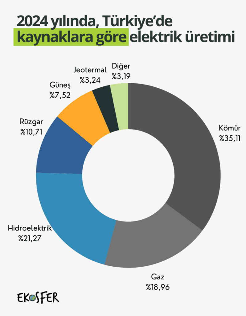 2024 yılında Türkiye’de elektrik üretiminde yenilenebilir enerji kaynaklarının payı arttı, kömür ve gazın payı ise düştü. Elektrik üretiminin 343 milyar kilovatsaate çıktığı 2024 yılında, hidroelektrik santrallar da hesaba katılırsa yenilenebilir enerji kaynaklarının elektrik üretimindeki payı %45’i geçti. Bir yıl önce bu oran %42’ydi. Hidroelektrik santralların payı %21,3’e ulaşırken, rüzgarın payı 10,7, güneşin payı ise 7,5 oldu. Bu kaynakları %3,2 ile jeotermal, 2,6 ile biyokütle santralları izledi. İthal kömürle çalışan termik santrallar ise elektrik üretiminde en yüksek paya sahip birincil enerji kaynağı olma özelliğini bu yıl da sürdürdü.