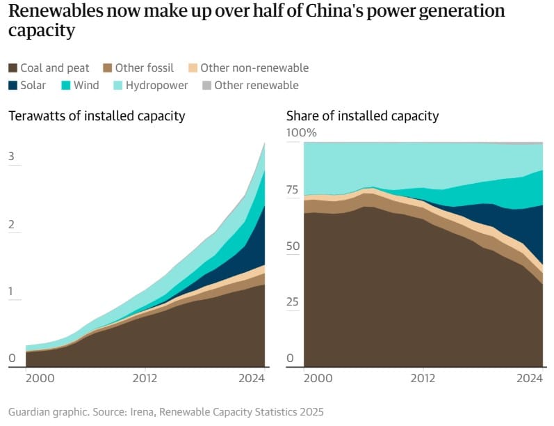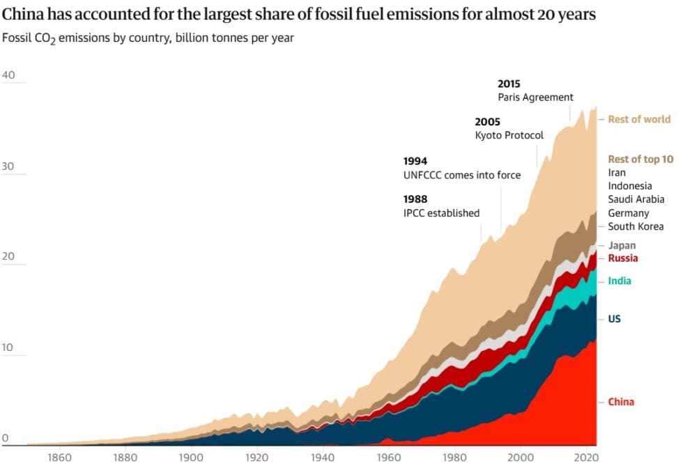 Çin’in temiz enerji yatırımları dikkat çekici boyutlarda. Sadece 2023’te kurulan rüzgâr ve güneş enerjisi kapasitesi, dünyanın geri kalanının toplamının iki katına ulaştı. Bu yatırımlar sayesinde Çin, planlanandan altı yıl önce 1.200 GW kurulu güce erişti. Ülke aynı zamanda fotovoltaik hücre, elektrikli araç ve rüzgâr türbini üretiminde küresel pazarın büyük kısmını kontrol ediyor. Asya Topluluğu Çin İklim Merkezi Direktörü Li Shuo’ya göre, ❝Temiz enerjide tek bir oyuncu var. ABD ortada bile değil❞.
