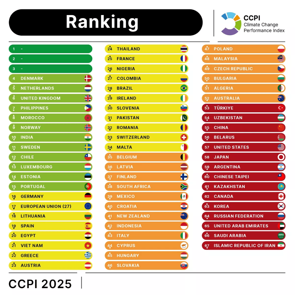 CCPI raporu, yenilenebilir enerji kaynaklarındaki ilerlemeye rağmen birçok ülkenin hâlâ fosil yakıt iş modeline sıkı sıkıya bağlı olduğunu gösteriyor. Çin ve ABD gibi en büyük emisyon yapan ülkeler, sıralamanın alt sıralarında yer aldı. İran, Suudi Arabistan, Birleşik Arap Emirlikleri ve Rusya ise fosil yakıtlara bağımlılıkları nedeniyle en düşük performansı sergileyen ülkeler oldu.